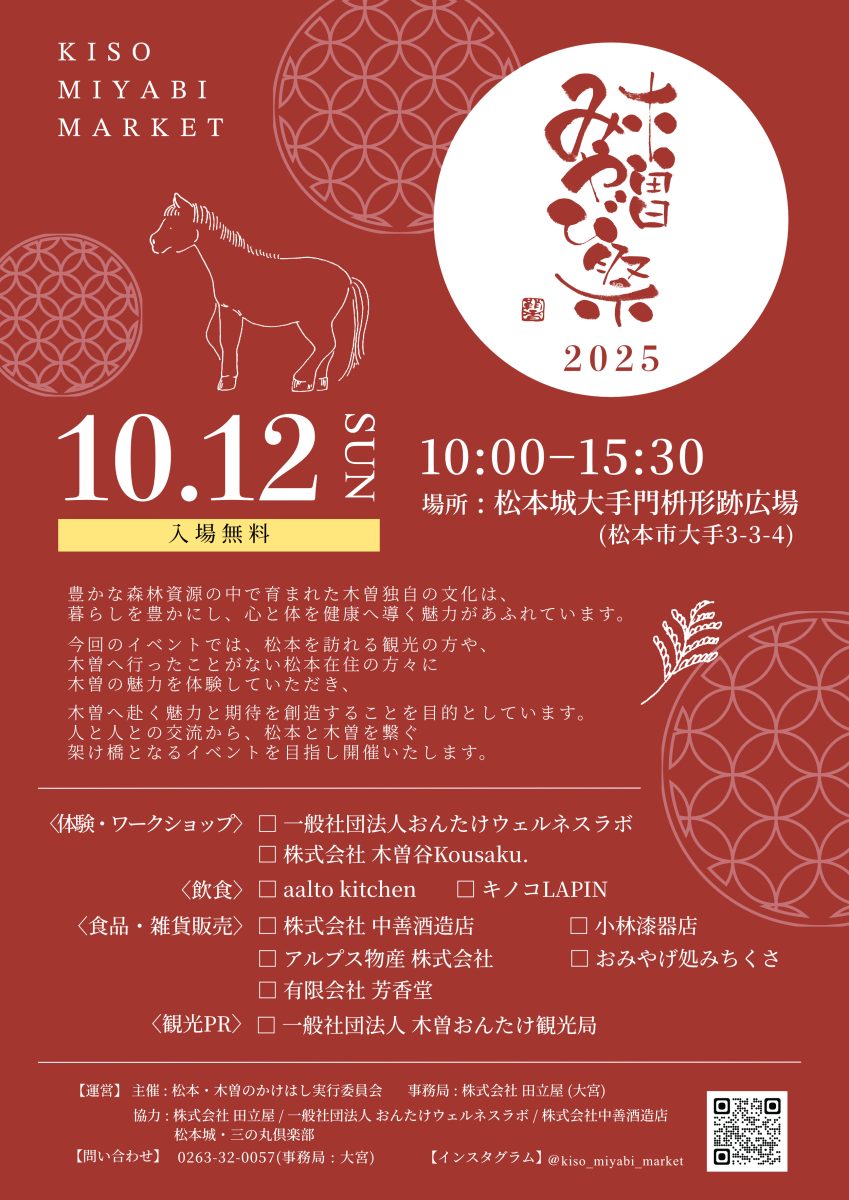 - 協力:株式会社田立屋 / 一般社団法人おんたけウェルネスラボ / 株式会社中善酒造店 / 松本城・三の丸倶楽部