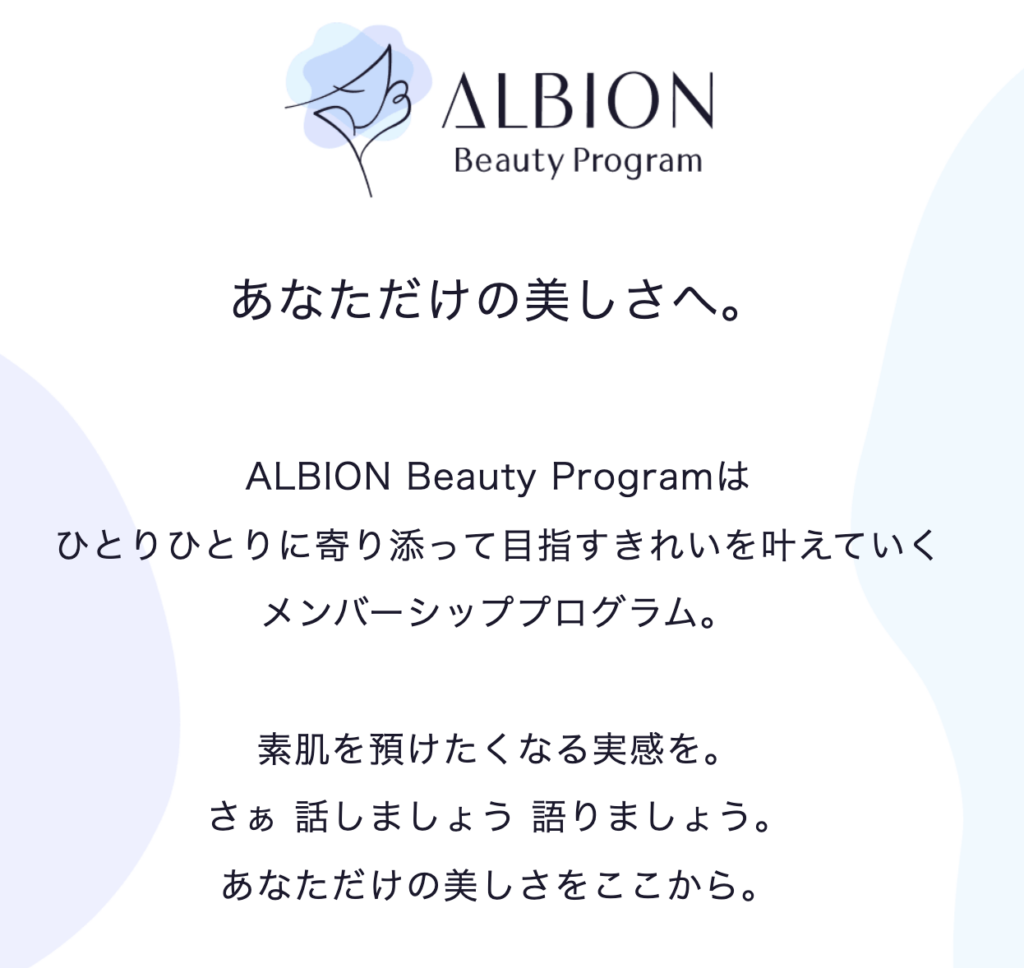 詳細はこちら→https://albion.co.jp/site/albionbeautyprogram/index.aspx?utm_source=google&utm_medium=cpc&utm_content=membership01&utm_campaign=google_des_membership